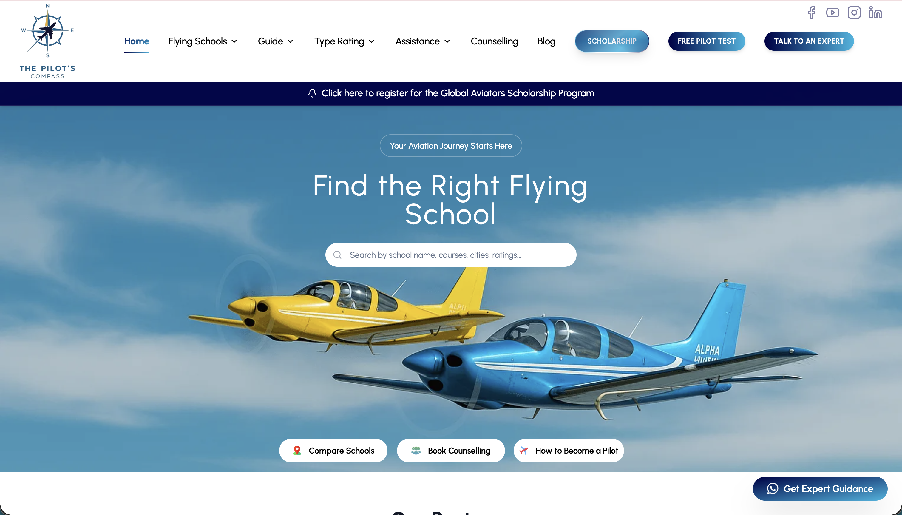 A comprehensive web platform helping aspiring pilots find and compare DGCA, FAA, and EASA-approved flying schools worldwide. Features verified school listings, fleet details, CPL cost breakdowns, type rating guidance, and expert counselling to simplify the path to a commercial pilot license.
